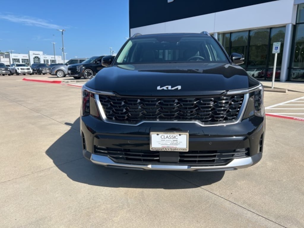 The 2025 Kia Sorento comes with the following features; Panoramic Sunroof Package (LED Interior Lighting and Panoramic Power Sunroof w/Power Sunshade), 3rd row seats: split-bench, 4-Wheel Disc Brakes, 6 Speakers, ABS brakes, Air Conditioning, Alloy wheels, AM/FM radio: SiriusXM, Apple CarPlay & Android Auto, Auto High-beam Headlights, Auto-dimming Rear-View mirror, Automatic temperature control, Brake assist, Bumpers: body-color, Carpeted Floor Mats, Delay-off headlights, Driver door bin, Driver vanity mirror, Dual front impact airbags, Dual front side impact airbags, Electronic Stability Control, Emergency communication system: 911 Connect, Exterior Parking Camera Rear, Four wheel independent suspension, Front anti-roll bar, Front Bucket Seats, Front Center Armrest, Front dual zone A/C, Front fog lights, Front reading lights, Fully automatic headlights, Heated door mirrors, Heated Front Bucket Seats, Heated front seats, Illuminated entry, Knee airbag, Leather Shift Knob, Leather steering wheel, Low tire pressure warning, Navigation System, Occupant sensing airbag, Outside temperature display, Overhead airbag, Overhead console, Panic alarm, Passenger door bin, Passenger vanity mirror, Power door mirrors, Power driver seat, Power Liftgate, Power passenger seat, Power steering, Power windows, Radio data system, Radio: AM/FM Standard Sound System, Rear anti-roll bar, Rear reading lights, Rear side impact airbag, Rear window defroster, Rear window wiper, Remote keyless entry, Security system, Speed control, Speed-sensing steering, Split folding rear seat, Spoiler, Steering wheel mounted audio controls, SynTex Artificial Leather Seat Trim, Tachometer, Telescoping steering wheel, Tilt steering wheel, Traction control, Trip computer, Turn signal indicator mirrors, Variably intermittent wipers, and Wheels: 20" Machine-Finished Gloss Black Alloy.