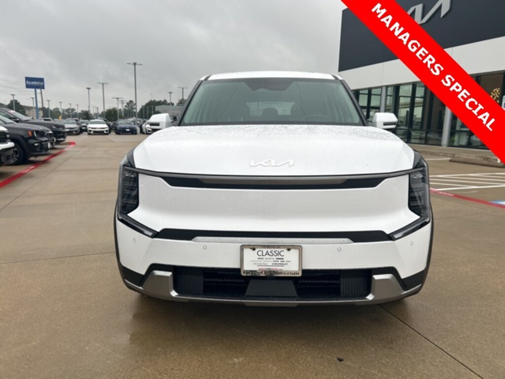 The 2026 Kia EV9 comes with the following features; 3rd row seats: split-bench, 4-Wheel Disc Brakes, 8 Speakers, ABS brakes, Air Conditioning, Alloy wheels, AM/FM radio: SiriusXM, Apple CarPlay & Android Auto, Auto High-beam Headlights, Auto-dimming Rear-View mirror, Automatic temperature control, Brake assist, Bumpers: body-color, Cargo Cover, Carpeted Floor Mat, 7-Passenger, Delay-off headlights, Driver door bin, Driver vanity mirror, Dual front impact airbags, Dual front side impact airbags, Electronic Stability Control, Emergency communication system: 911 Connect, Exterior Parking Camera Rear, Folding Cargo Tray, Four wheel independent suspension, Front anti-roll bar, Front Bucket Seats, Front Center Armrest w/Storage, Front dual zone A/C, Front reading lights, Full SynTex Leather Seat Trim, Fully automatic headlights, Garage door transmitter: HomeLink, Heated and Ventilated Front Bucket Seats, Heated door mirrors, Heated front seats, Illuminated entry, Knee airbag, Low tire pressure warning, Navigation System, Occupant sensing airbag, Outside temperature display, Overhead airbag, Overhead console, Panic alarm, Passenger door bin, Passenger vanity mirror, Power door mirrors, Power driver seat, Power Liftgate, Power moonroof, Power passenger seat, Power steering, Power windows, Radio data system, Radio: AM/FM/HD /SiriusXM, Rain sensing wipers, Rear air conditioning, Rear anti-roll bar, Rear reading lights, Rear seat center armrest, Rear window defroster, Rear window wiper, Reclining 3rd row seat, Remote keyless entry, Security system, Speed control, Speed-sensing steering, Split folding rear seat, Spoiler, Steering wheel mounted audio controls, Telescoping steering wheel, Tilt steering wheel, Traction control, Trip computer, Turn signal indicator mirrors, Variably intermittent wipers, Ventilated front seats, and Wheels: 19" Black and Machined Finished Alloy.